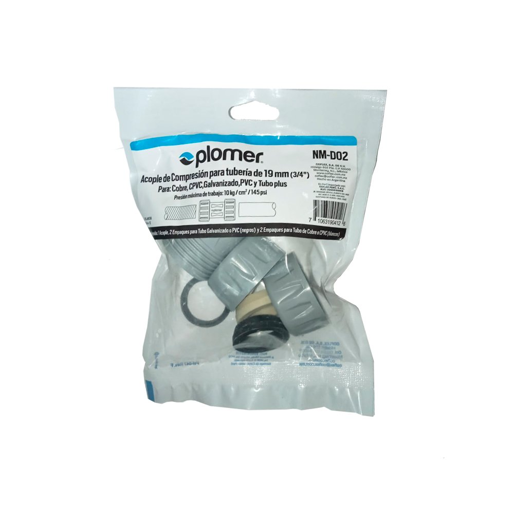 Acople de 3/4 de pulgada (19 mm) para compresión marca Coflex, modelo NM-D02. Sirve para unir y reparar tubería galvanizada (empaques negros), PVC (empaques negros), cobre (empaques blancos), CPVC (empaques blancos). Están fabricados de polipropileno (acople) y santoprene (empaques).