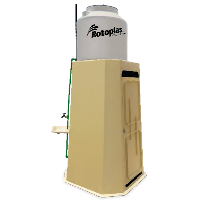 Fabricado con HDPE 100% virgen de una sola pieza (polietileno de alta densidad). Sistema de baño digno para comunidades apartadas, especificado para proyectos de desarrollo social en gobierno.