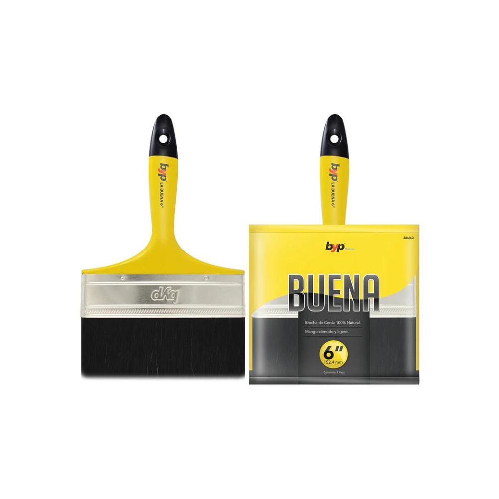 La Brocha de 6 pulgadas de byp, sirve para uso doméstico apta para toda clase de pinturas, su fabricación con fibras 100% naturales brindan un alto rendimiento, sus cerdas abundantes y largas ayudan a lograr en menos tiempo mejores acabados. Cuenta con mango plástico resistente y ergonómico que facilita el agarre y manejo por su ligereza, su corte es recto ideal para una distribución uniforme de la pintura. Se encuentra adherida con pegamento epóxico y reforzada con un casquillo de lámina de hojalata que evita su pronto desprendimiento.