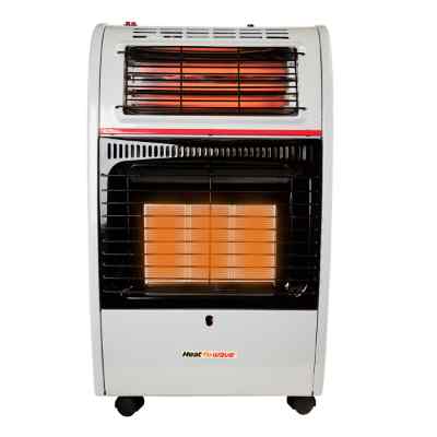 Calefactor portátil de gas. L.P modelo hg3rq, 3 radiantes de cerámica, compartimiento para tanque 10kg y calefaccion electrica de cuarzo.