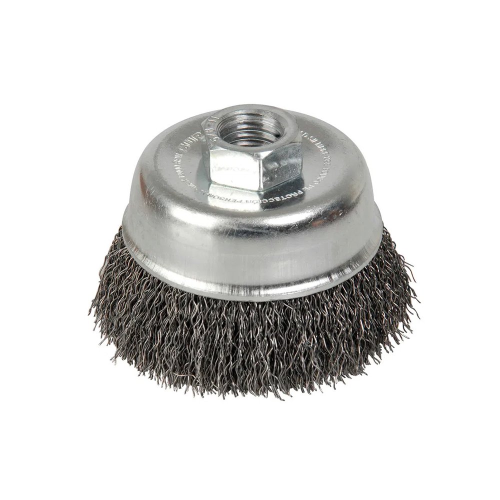 Carda copa ondulada alambre delgado de 3″ pulgadas x 0.35 mm con rosca estándar de 5/8″ marca Surtek. El alambre está fabricado de acero alto carbono, ondulado. Ideal para utilizarse en esmeriladoras y mini esmeriladora angular. Su velocidad máxima es de 12 500 RPM. Ideal para lograr acabados semipulidos.