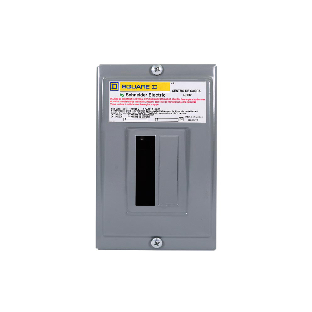 Centro de carga para uso residencial y comercial ligero de montaje de sobreponer. Cuenta con conectores tipo opresor para fácil conexión. Envolvente de lámina de acero rolada en frío. Gabinete tipo 1. Para utilizar en interior. Terminales de aluminio de estañado para mayor protección. Cumple con la NOM. 240 V. Máximo Tipo NEMA 1. Centro de carga QOD, con voltaje de 120/240V, 1 Fase y 3 Hilos. Soporta amperes de hasta máximo 50. Su frecuencia es de 60 Hz. Alimentación zapatas principales para recibir la alimentación de energía eléctrica y distribuirla a los circuitos derivados en que se instalan los interruptores QO. Capacidad interruptiva hasta 10 000 A.