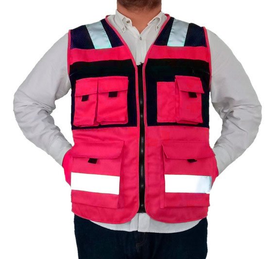 Chaleco de seguridad rosa modelo Ranger. Esta prenda de seguridad ha sido diseñada para aquellos profesionales que realizan sus actividades de trabajo en exteriores calurosos ya que su combinación de malla en frente y espalda le proporciona ventilación en todo momento sin restarle funcionalidad, cuenta con 7 bolsillos al frente y 1 más en la espalda para documentos. Fabricado con cintas reflejantes de 2 pulgadas color plata Tipo 3M (400 candelas).