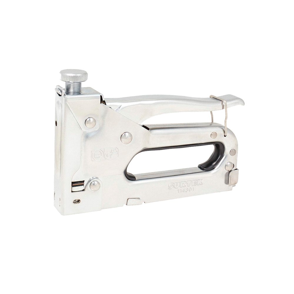 Engrapadora manual tipo pistola con ajuste de presión marca Surtek 4-8mm. Fabricada en acero acabado cromado. Con uña posterior para quitar grapas. Incluye grapas. Corona 7/16″ y calibre 0,8 mm. Usa grapas de 1/4″ y 5/16″. Tipo «T-21». Cuenta con perilla que sirve para ajuste de presión.
