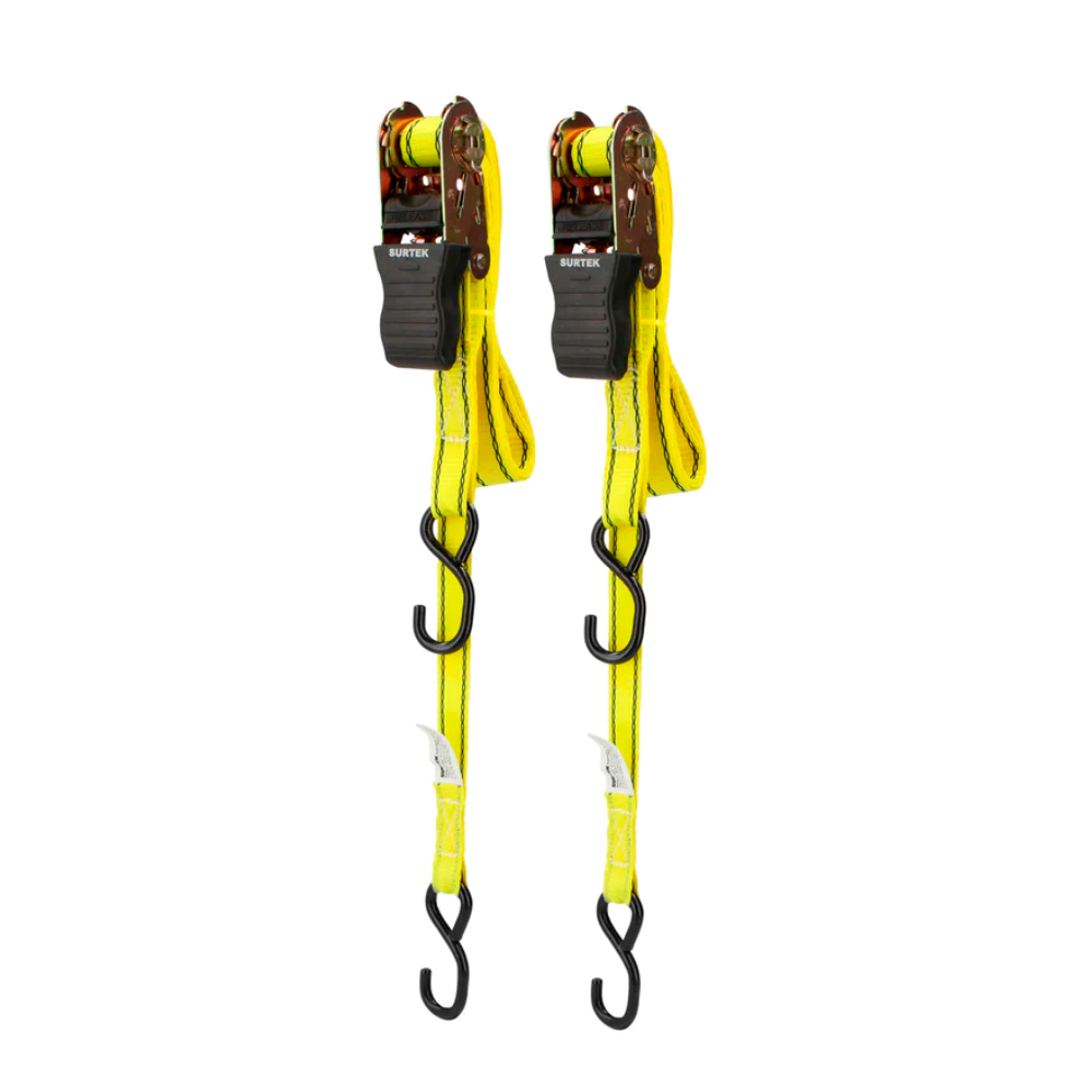 Juego de 2 sujetadores y tensores tipo matraca de carga marca Surtek de modelo 151154, fabricados con 100% de poliéster para una mayor resistencia, con medidas de 25.4 mm x 4.5 m (1” x 15´). Mecanismo de rápida liberación de la cinta, solo aprieta y asegura, es ideal para automóviles, lanchas, motocicletas, tractores, etcétera, soporta una carga máxima de trabajo de 227 kilogramos, ideal para las cargas pesadas