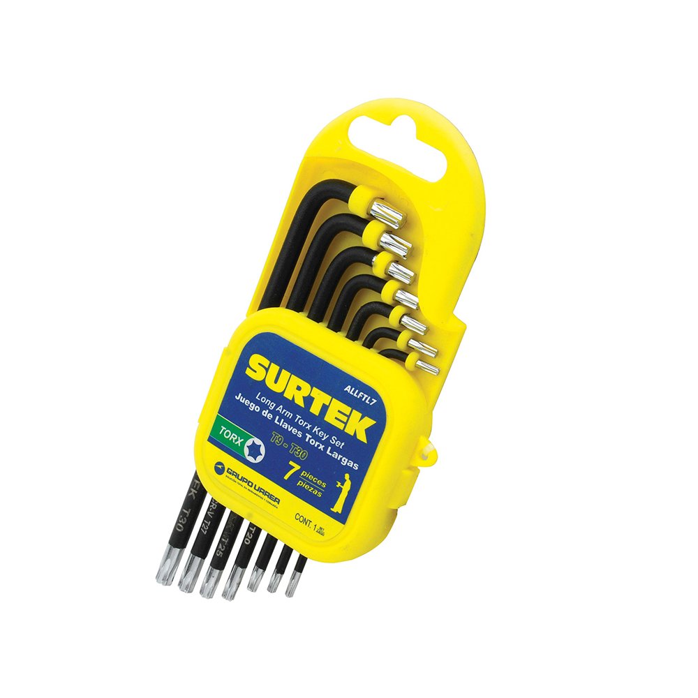 Juego de 7 llaves hexagonales tipo «L» Torx largas. Fabricadas en acero cromo vanadio (cr-v). Para uso profesional, estuche organizador con material plástico. Terminado satinado. Recubrimiento de pintura electroestática. Medias T9 – T10 – T15 – T20 – T25 – T27 – T30. Puntas cromadas en pulido espejo. Las llaves Torx destornillan o refuerzan tornillos con mayor precisión.