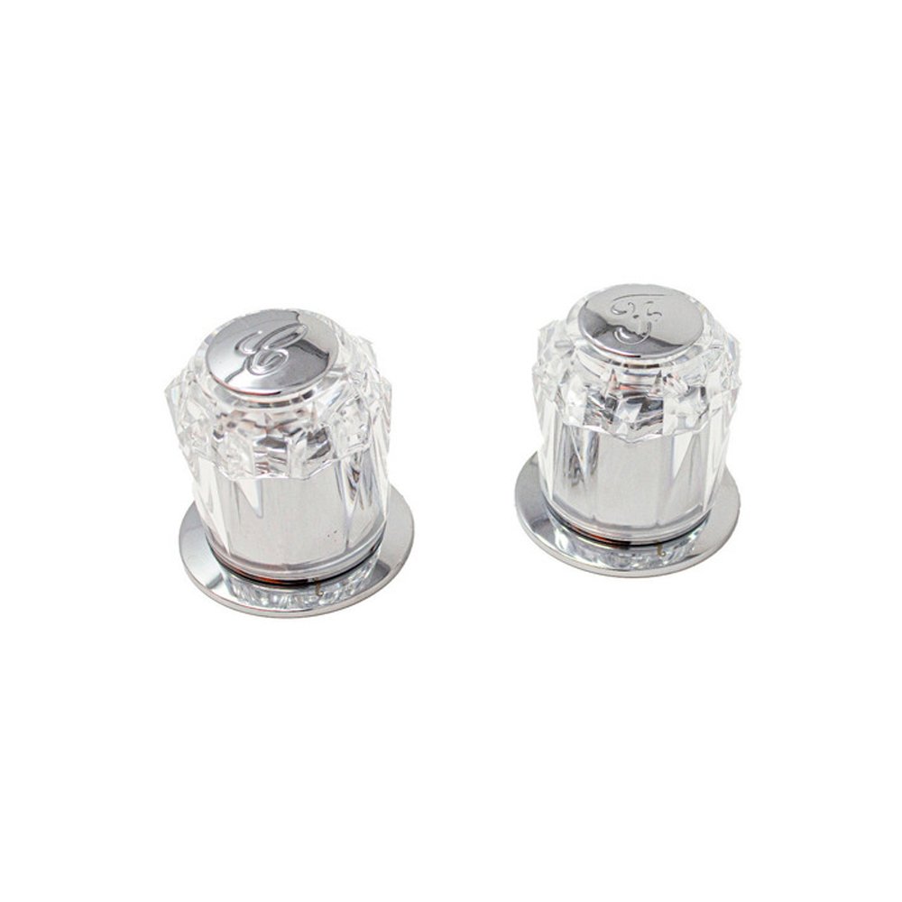 Juego de manerales grandes para regadera con 12 estrías trasparentes con cromo y chapetón, marca Rugo. Gracias a su diseño se acomodan con vástagos de vuelta completa (compresión) y/o ¼ de vuelta sin afectar su funcionamiento, por su diseño los hacen más cómodos de manipular aun con las manos húmedas o jabonosas.