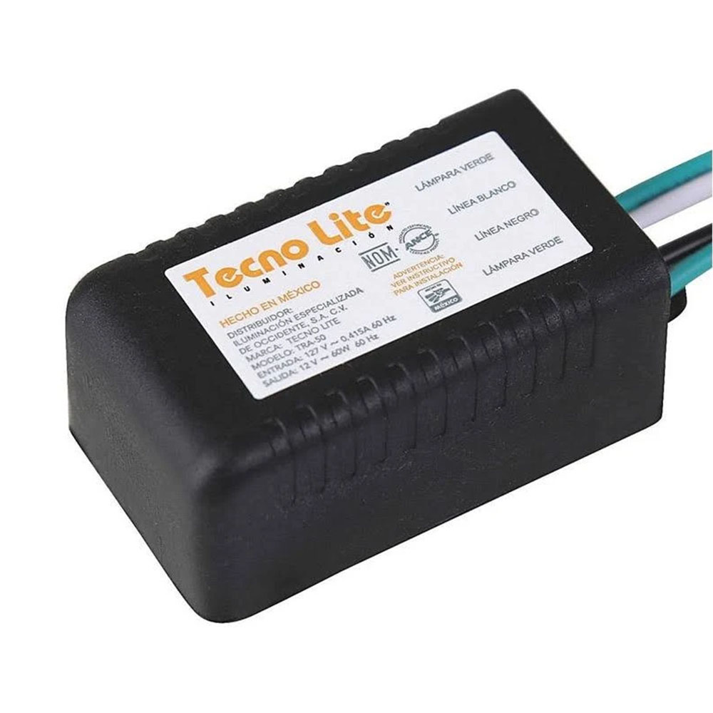 Transformador Eléctrico, 60 W, 127 V a 12 V, TRA-50 Tecnolite. Utiliza este transformador para conectar tus lámparas a 12 volts. Material: Plástico. Producto con certificación NOM.