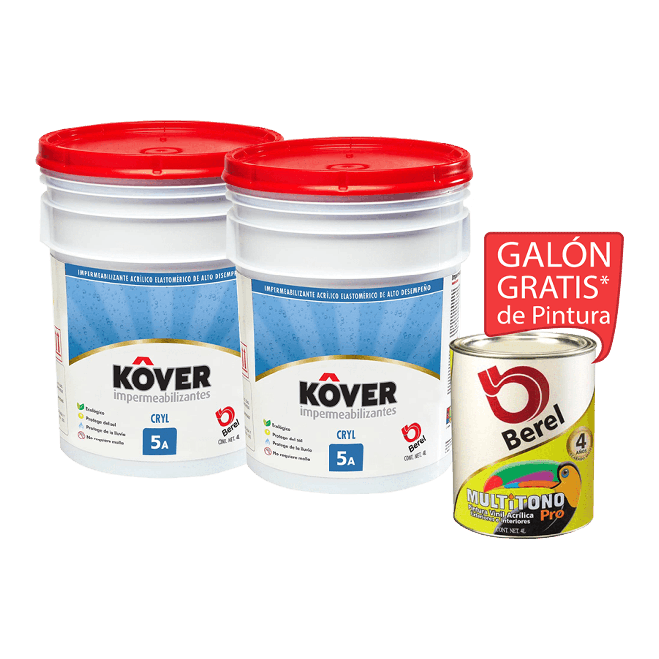 En la Compra de 2 Cubetas de Impermeabilizante Kover, llevate 1 Galón de Pintura Multitono Gratis de la marca Berel.
